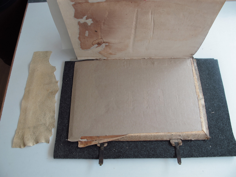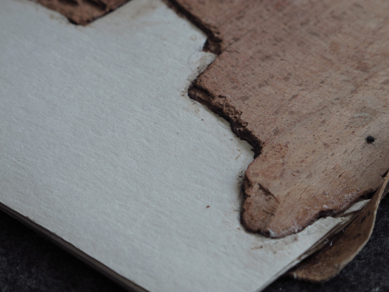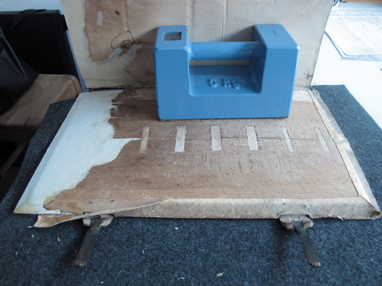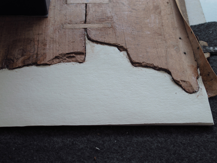 Uzupełnienie brakującyhch elementów deski oprawy – ubytki uzupełniono sklejoną zosobą warstwą papieru.