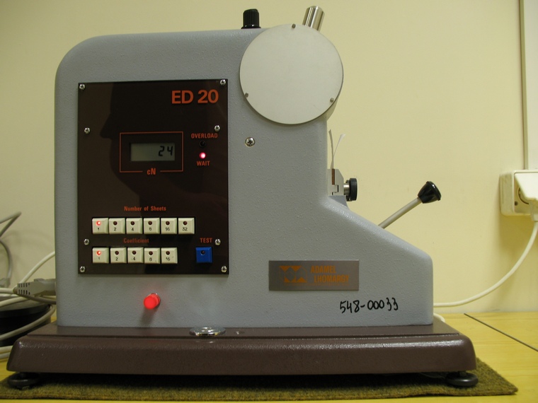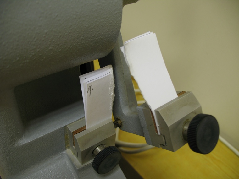 Oznaczanie podwójnego zginania papieru– próbki testowe. Oznaczenie wytrzymałości papieru na podwójne zginanie w aparacie Schoppera. Badanie polega na zginaniu do tyłu i do przodu paska papieru, aż do jego pęknięcia.