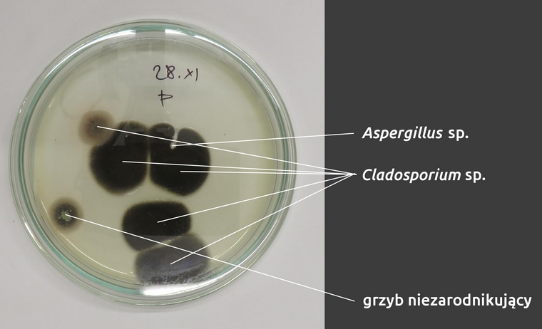 Na szalkę pobrano próbę (20 l) z powietrza atmosferycznego (tło). Podłoże MEA.