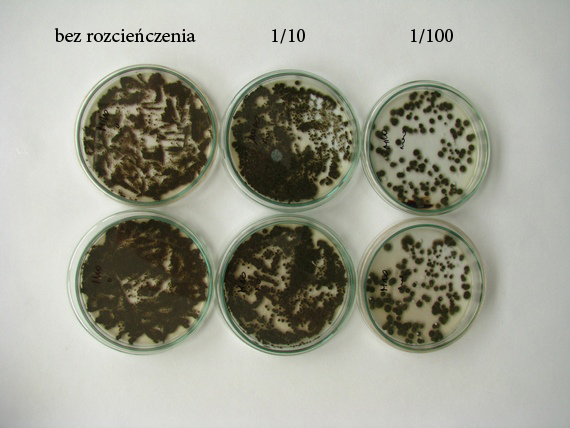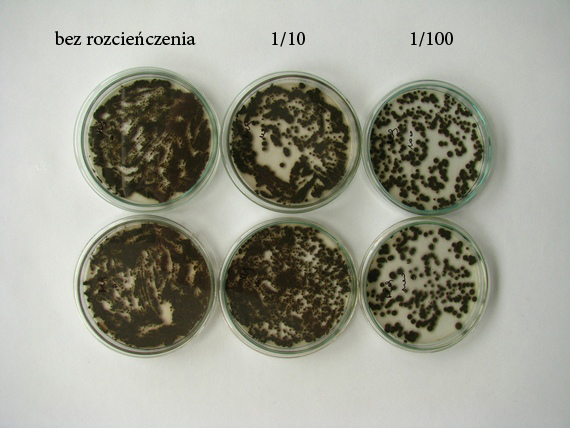 Oczywiście również zdarzają się przypadki, w których ilość koloni na szalce bez rozcieńczenia wynosi mniej niż 10 szt.