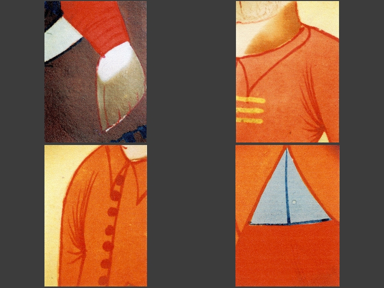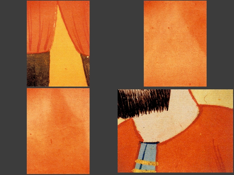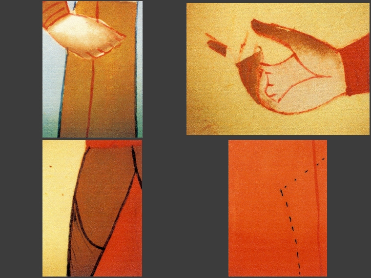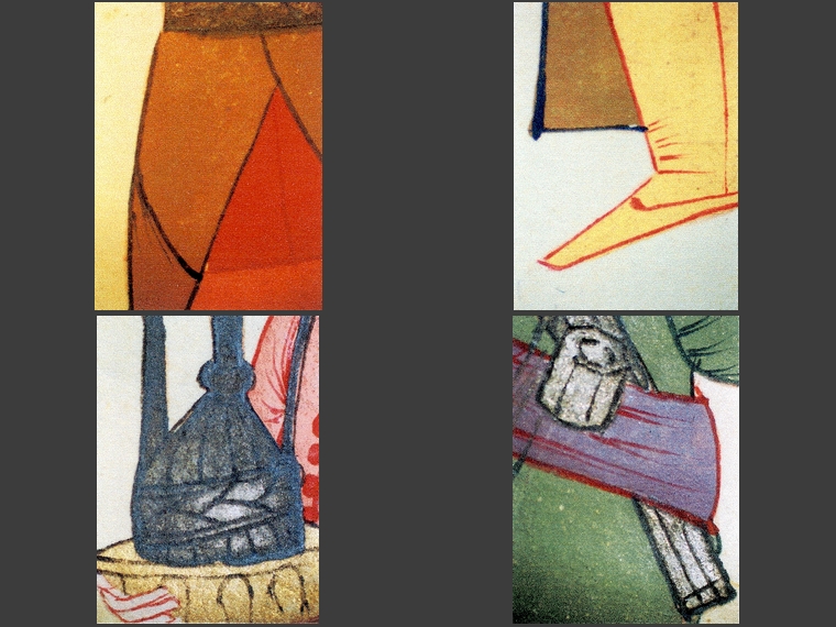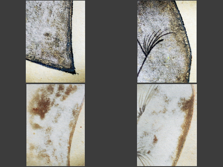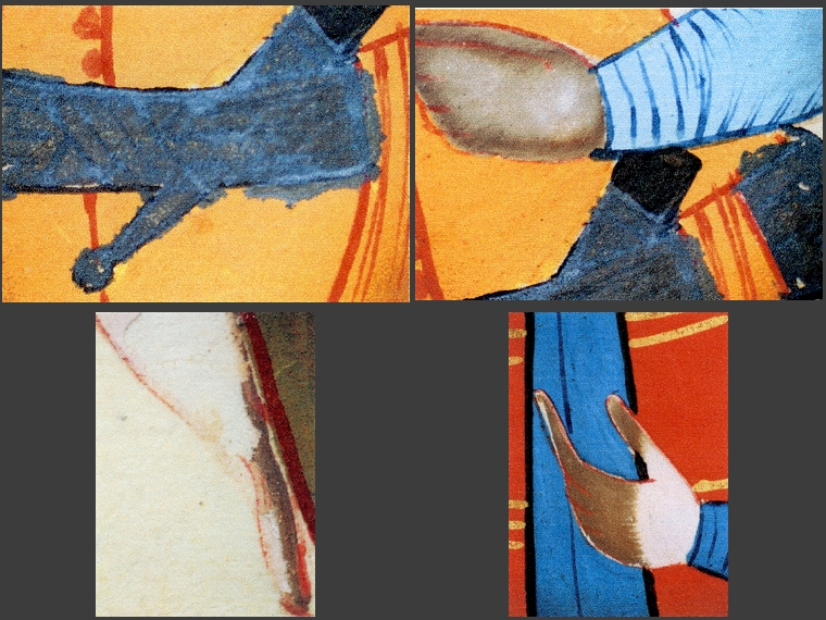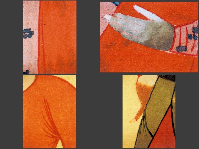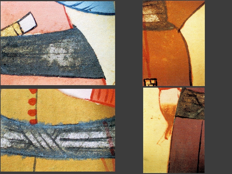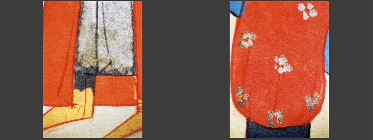 Podczas dokładnych oględzin stwierdzono zaawansowane zmiany kolorystyczne w warstwie malarskiej. Zmiany te przybierają przybierają postać zbrązowiałych partii w kremowej bieli (twarze, ręce postaci), czerwieni w odcieniu pomarańczowym (stroje) i czernienia białego metalu – srebra (szczegóły strojów, ramki wokół rysunków).